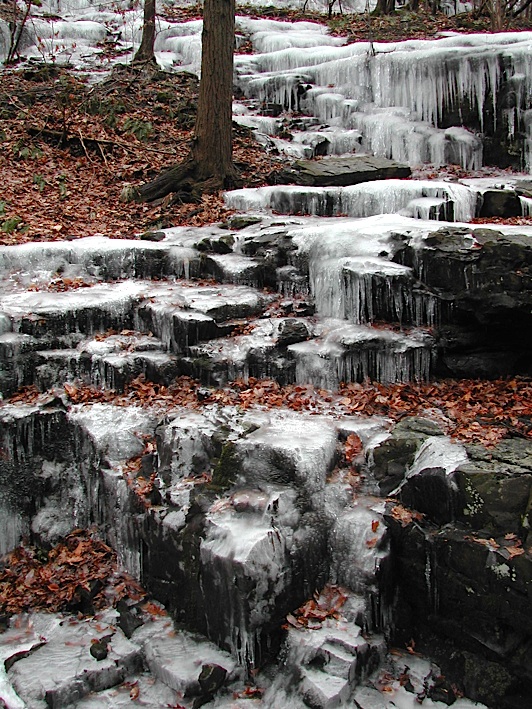The boulders are made of a substance called diabase which is basically volcanic basalt. This is one of the largest diabase boulder fields in the Eastern United States. The boulders have a high content of iron and aluminum and were thought to have broken apart during the Pleistocene Epoch probably about 12,000 years ago. The boulders were created through many years of freeze-thaw cycles that broke up the diabase into individual pieces, a process known as "frost wedging". The rocks may then have accumulated in this one area as the water saturated soil provided lubrication for the stones to "creep" downhill to their present location, a process known as "solifluction". This could have happened during the prior ice ages when overlying moist soil literally slid over the frozen permafrost below, carrying the boulders with it.